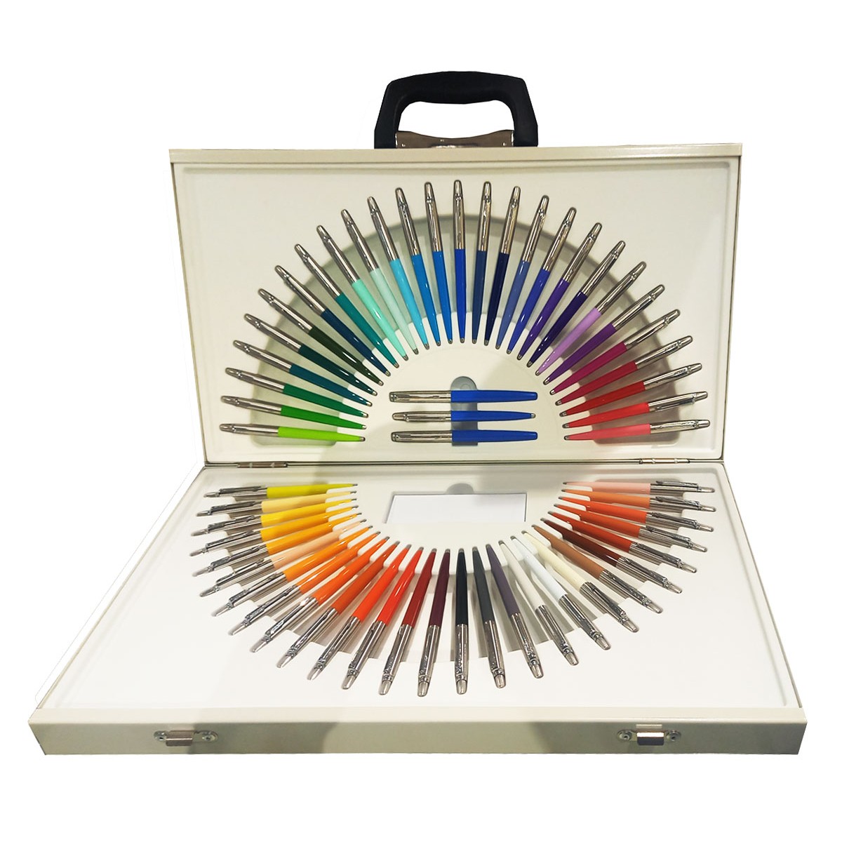 Il set comprende 54 penne a sfera Parker Jotter di colori diversi e tre Jotter di colore blu ( stilografica, roller e penna a sfera )